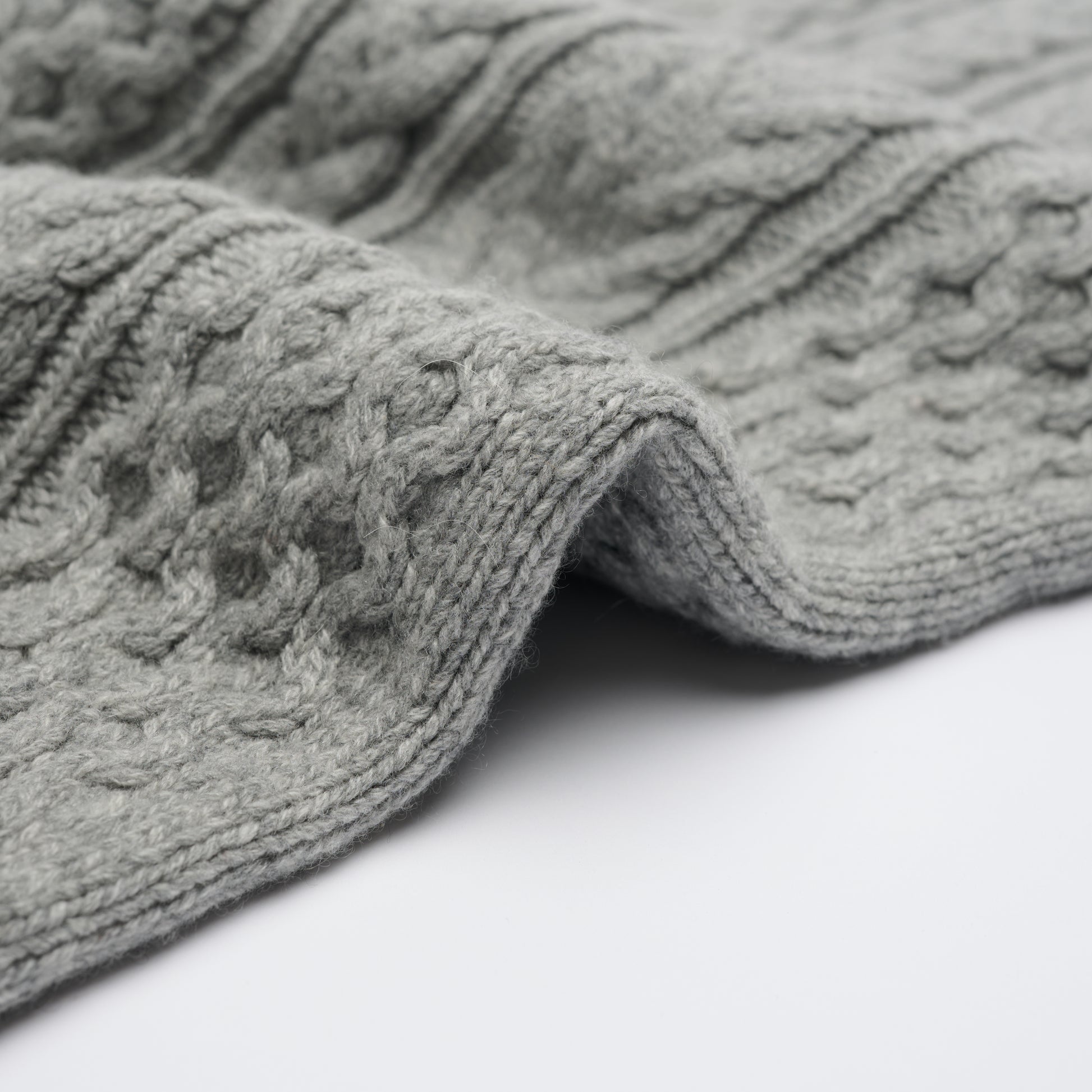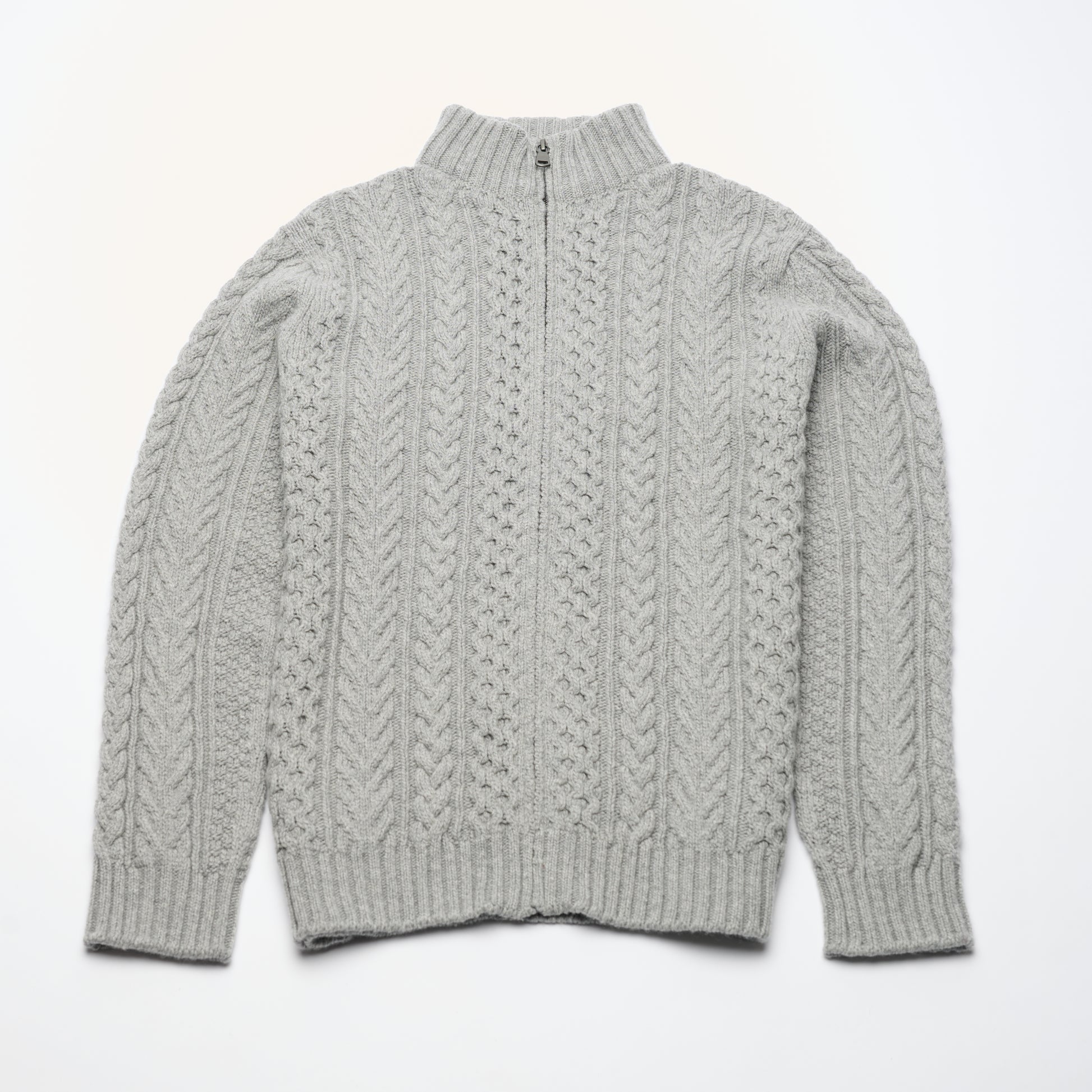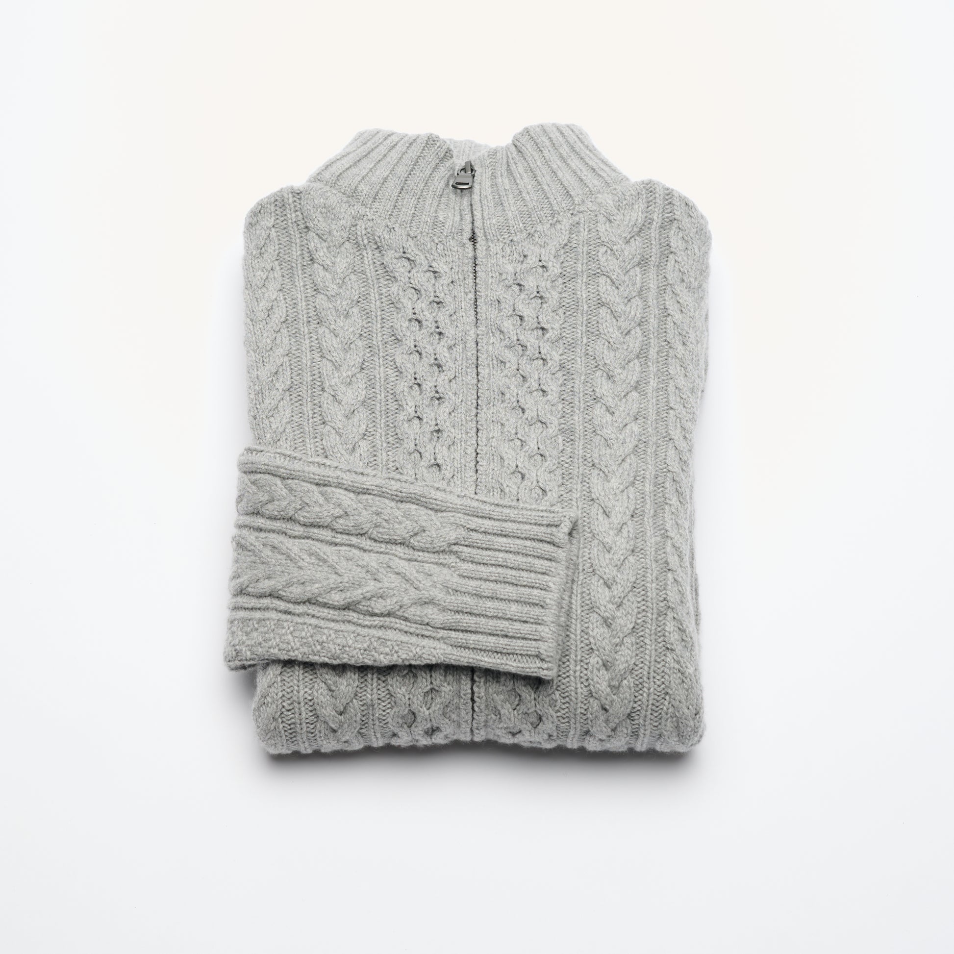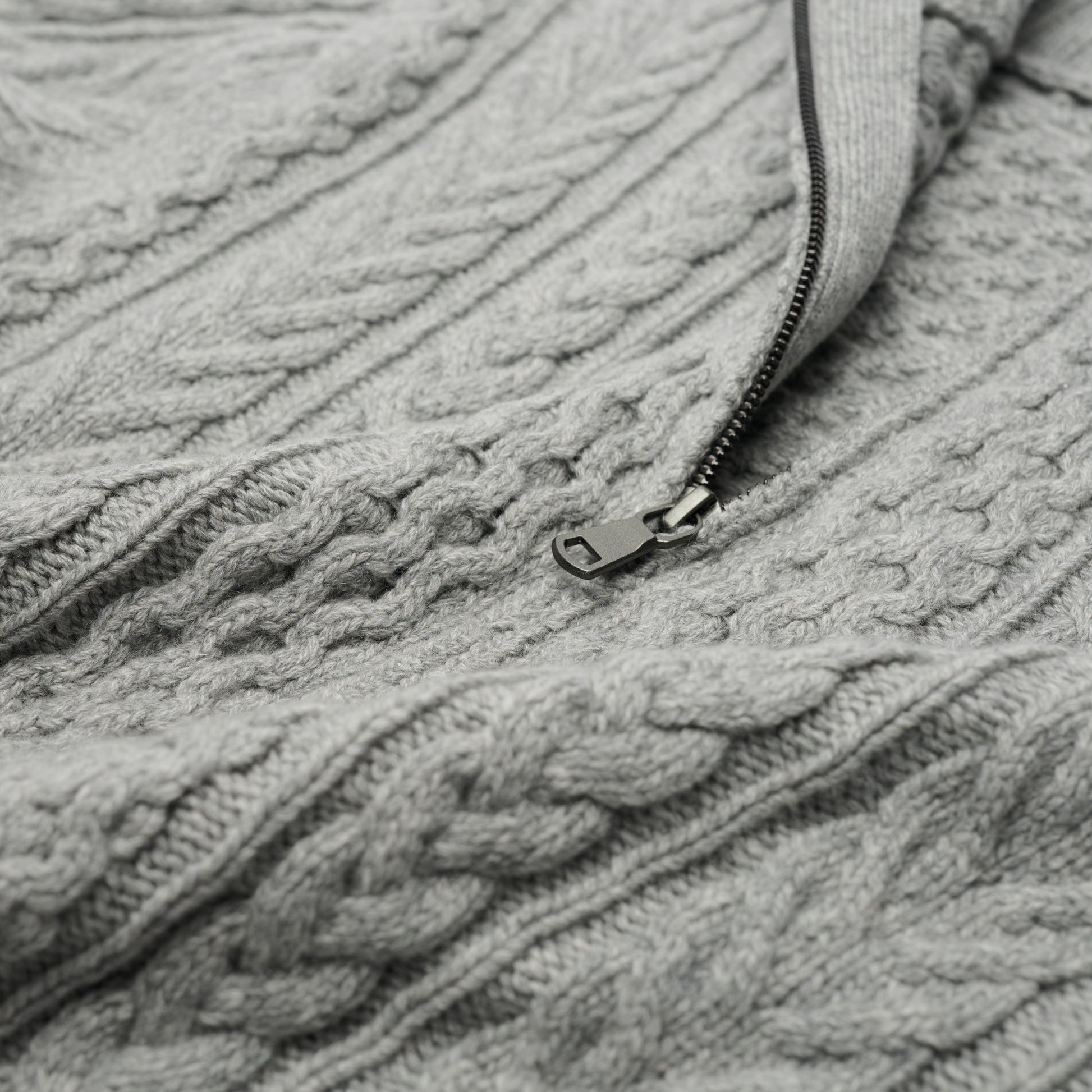This reimagined Aran cable knit pattern gives a modern twist to the traditional zip-up jumper. Featuring a double-ribbed neck trim and a full-length gunmetal zipper, it combines timeless style with contemporary details.