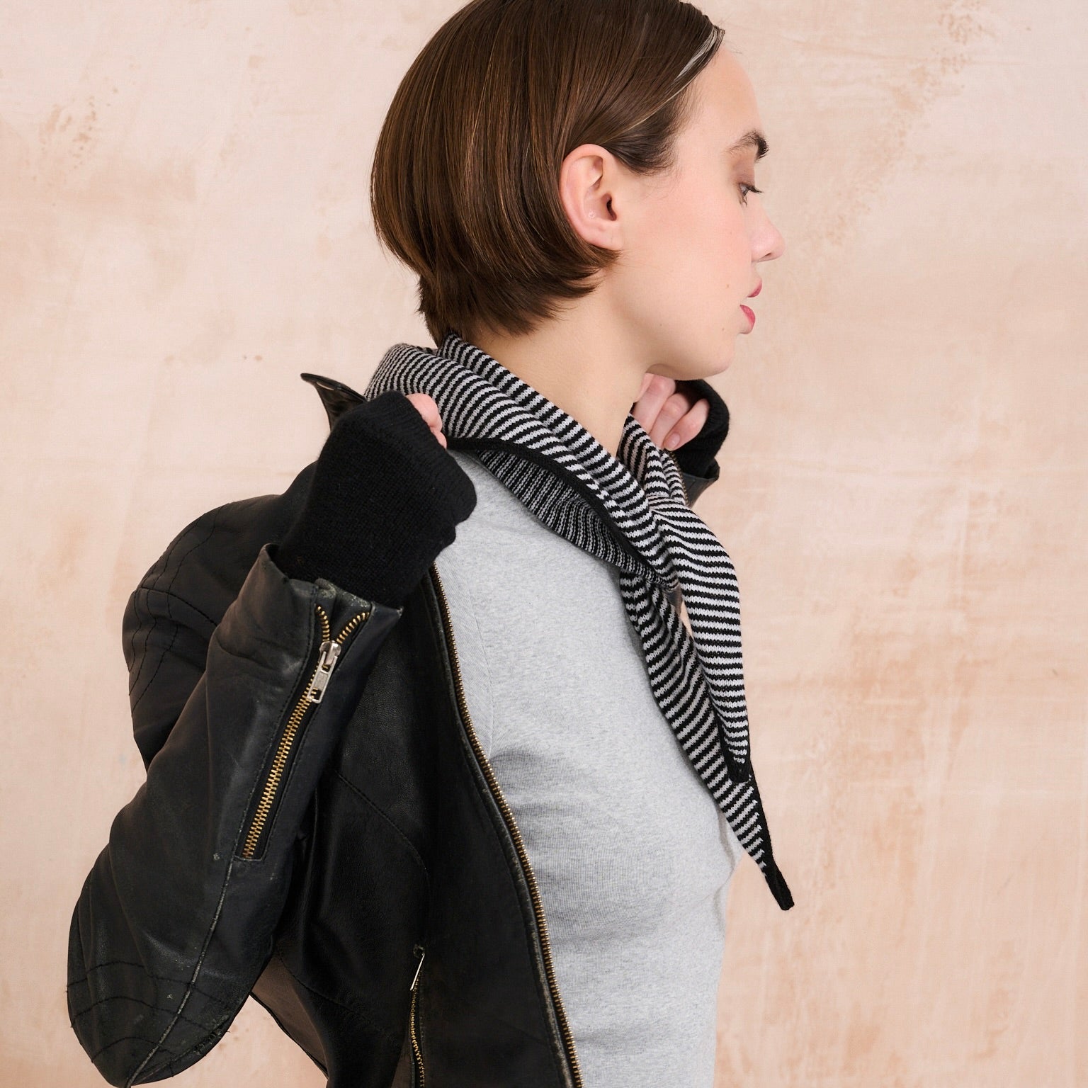 Triangle shaped cashmere bandana in black & white stripes with black bordered rolling edges. This neat cashmere scarf is the perfect universal accessory. It can be worn in various fun ways, around the neck or over your head and styled up or down, making it a sophisticated addition to any wardrobe.