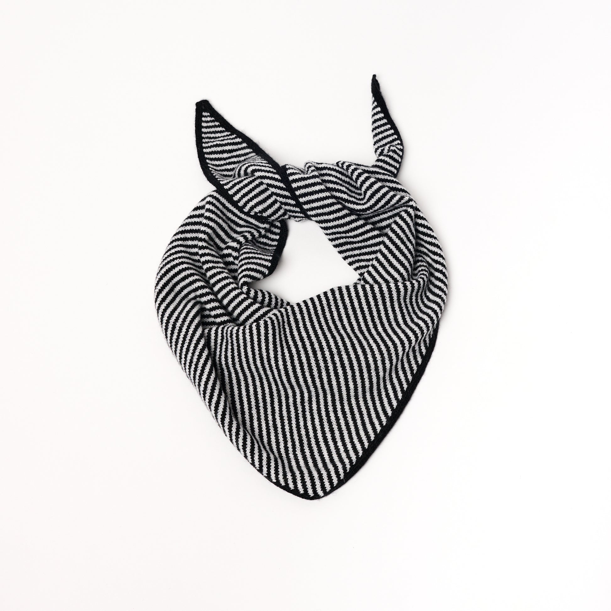 Made in Scotland from 100% cashmere, the bandana striped scarf features Black & White stripes. Soft, versatile, and timeless, it can be worn in various fun ways, around the neck or over your head and styled up or down, making it a sophisticated addition to any wardrobe.