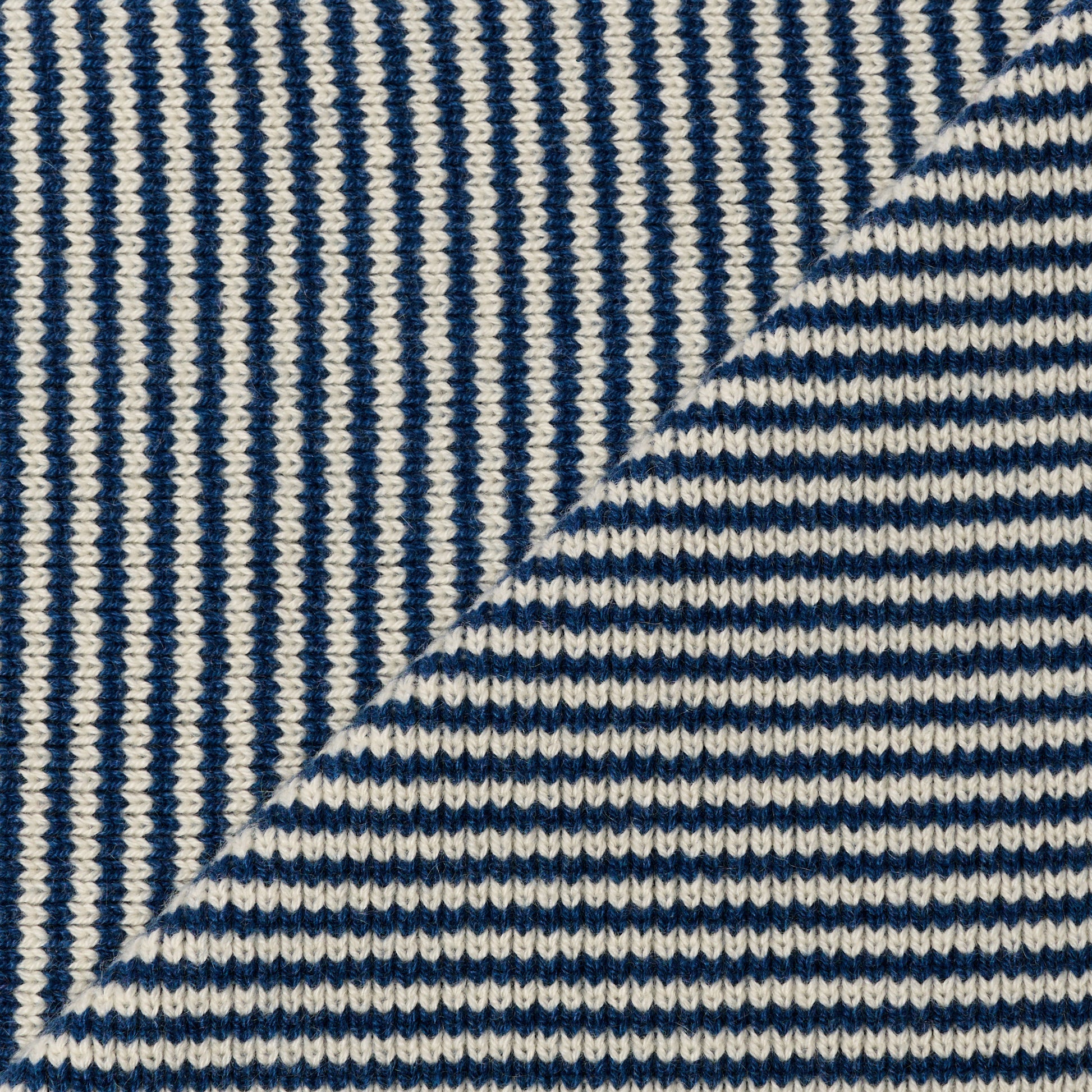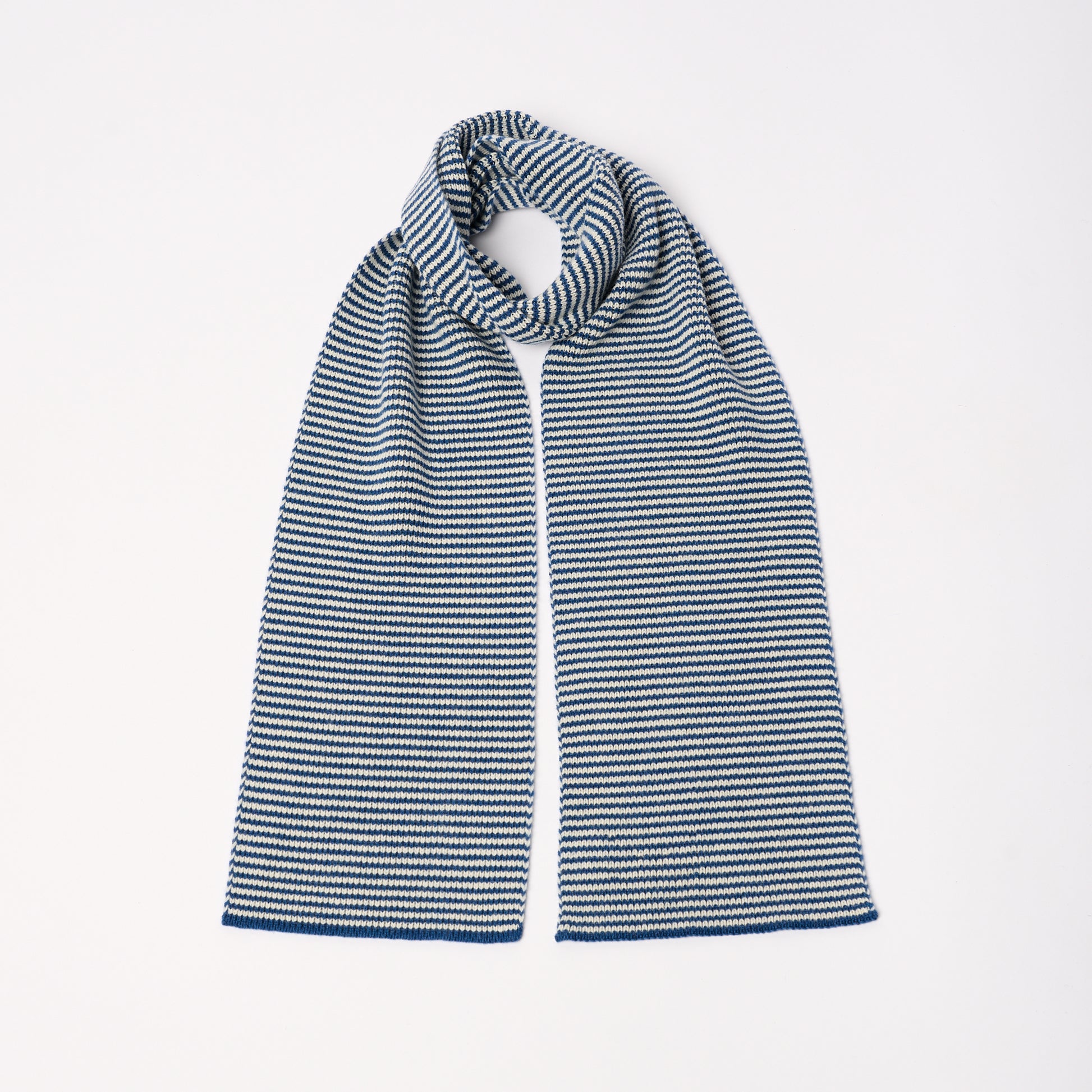 Made in Scotland from 100% pure cashmere, the Portobello striped scarf features Denim Blue & White stripes. Soft, versatile, and timeless, it can be worn doubled around the neck and styled up or down, making it a sophisticated addition to any wardrobe.