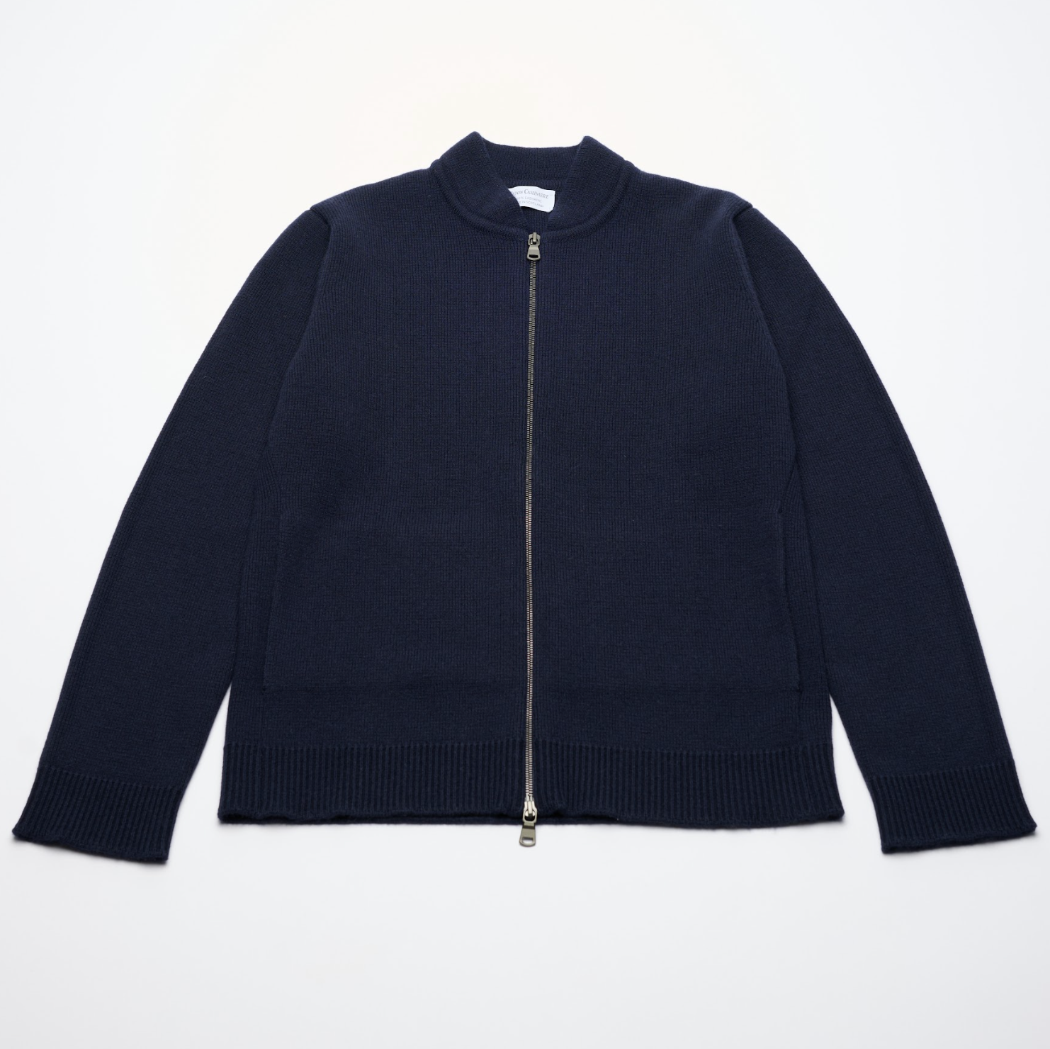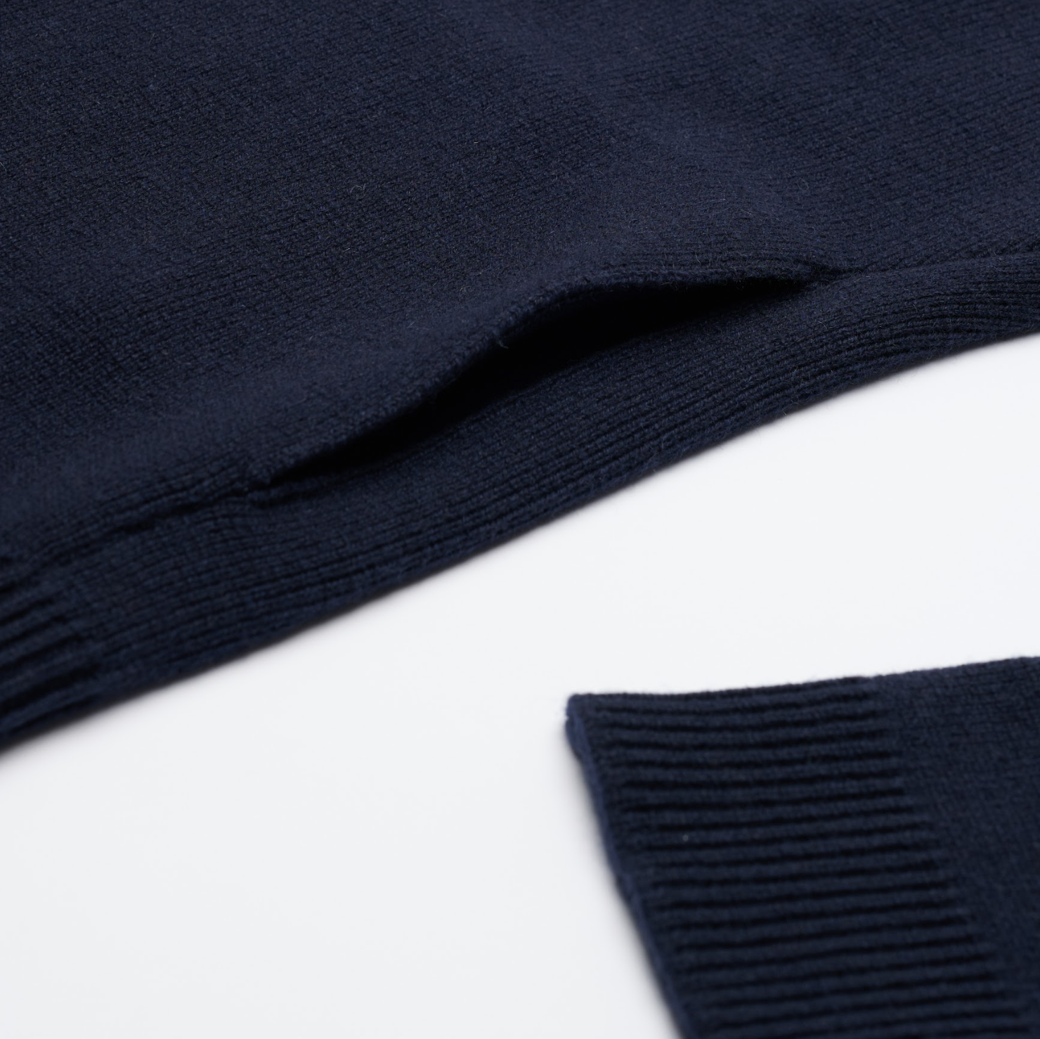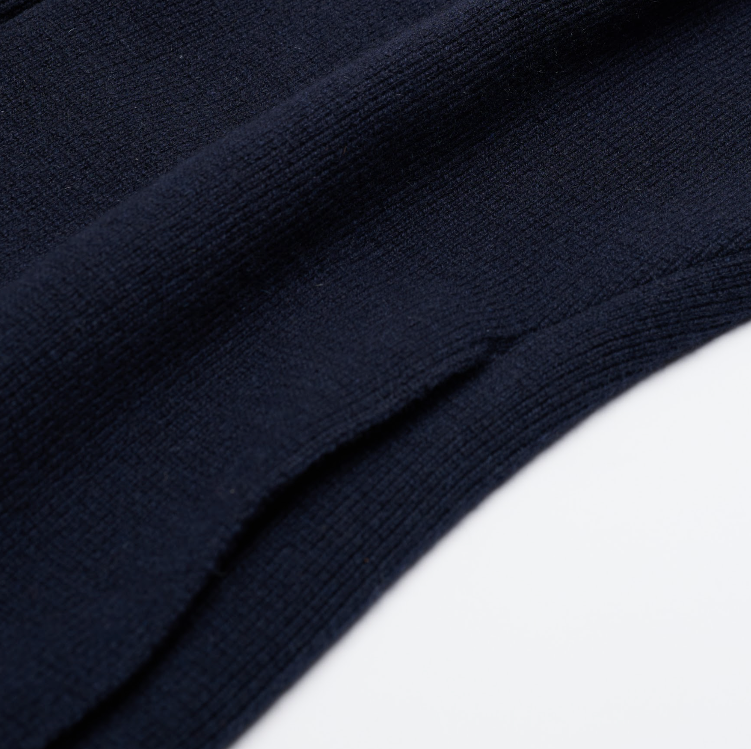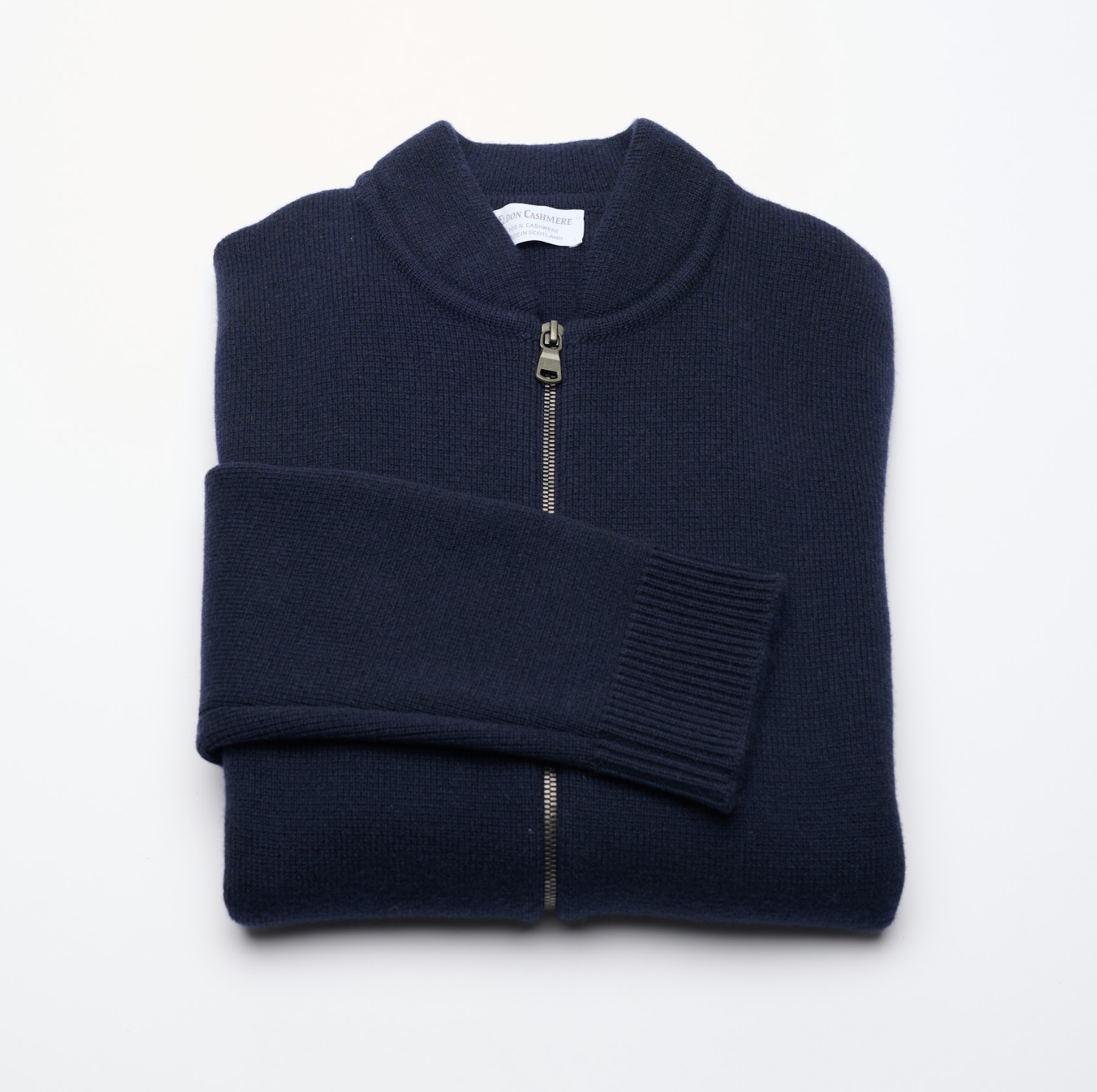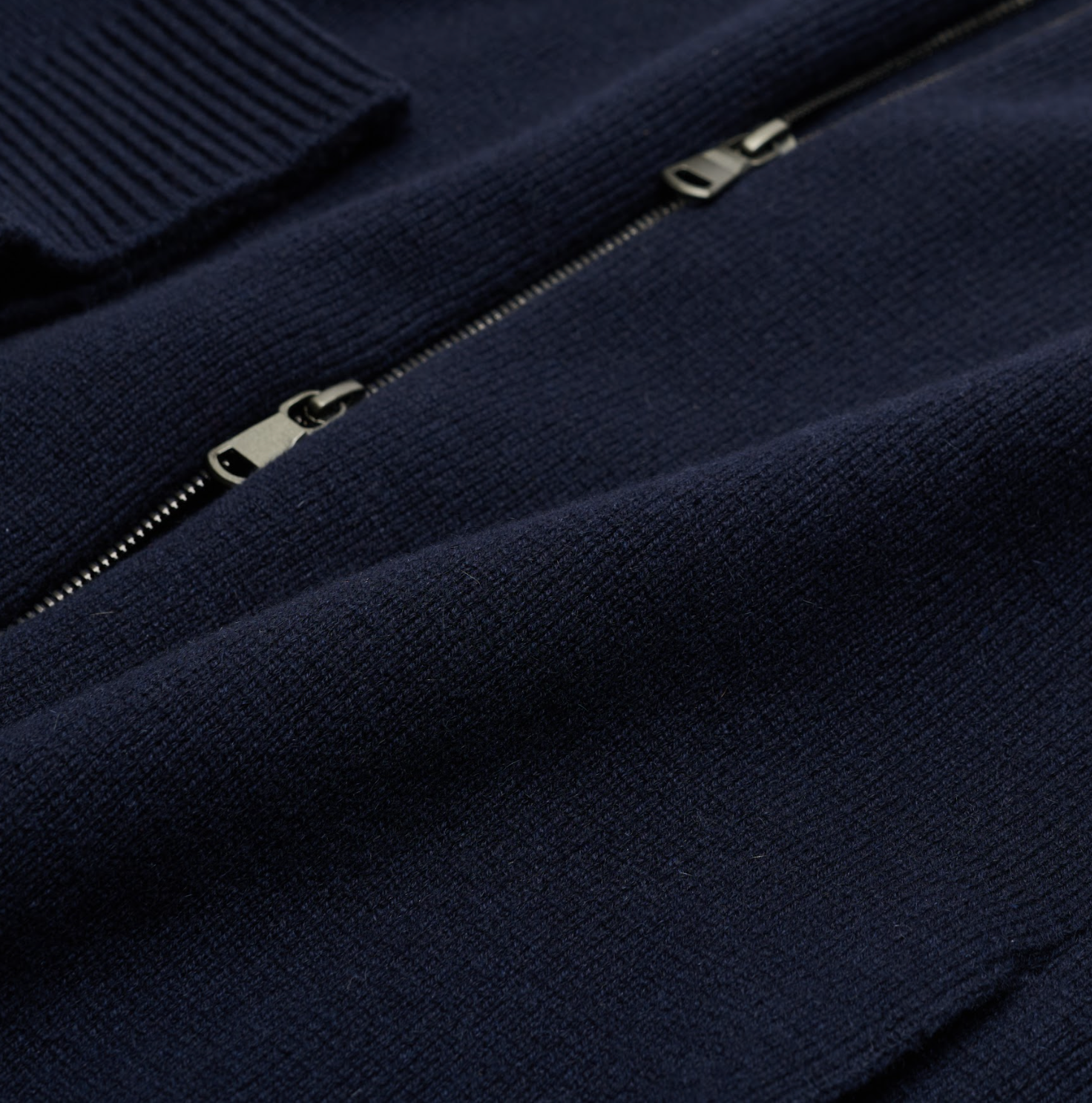 Elevate your outerwear with our Navy Cashmere Milano Stitch Baseball Zip Jacket. Crafted from heavyweight cashmere for a rich, indulgent feel, this piece showcases a refined Milano stitch for a clean, tailored finish. The contemporary baseball collar and double-ended gunmetal zip lend a modern edge, while discreet side pockets combine practicality with understated style.