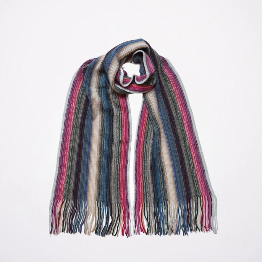 Multi Coloured Cashmere Striped Scarf with Tassels - With Red & Pink
