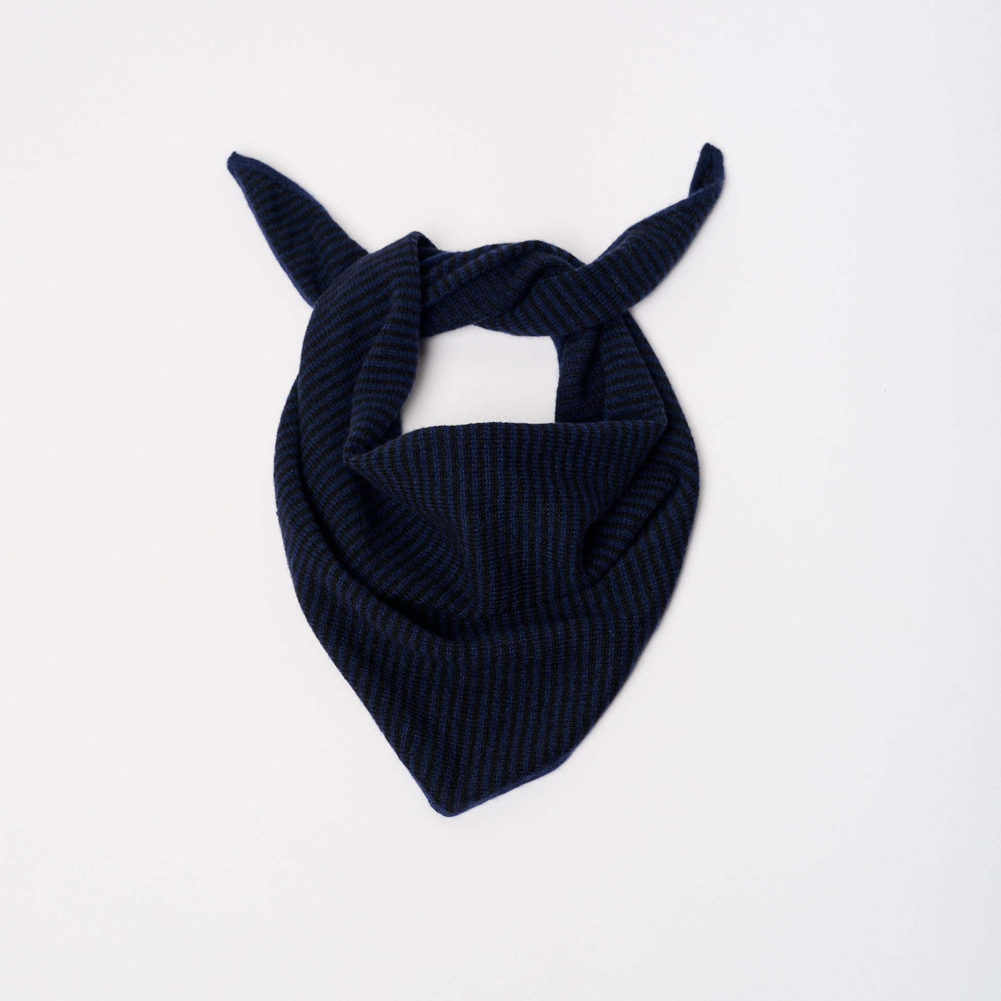 Made in Scotland from 100% cashmere, the bandana striped scarf features Navy & Black stripes. Soft, versatile, and timeless, it can be worn in various fun ways, around the neck or over your head and styled up or down, making it a sophisticated addition to any wardrobe.